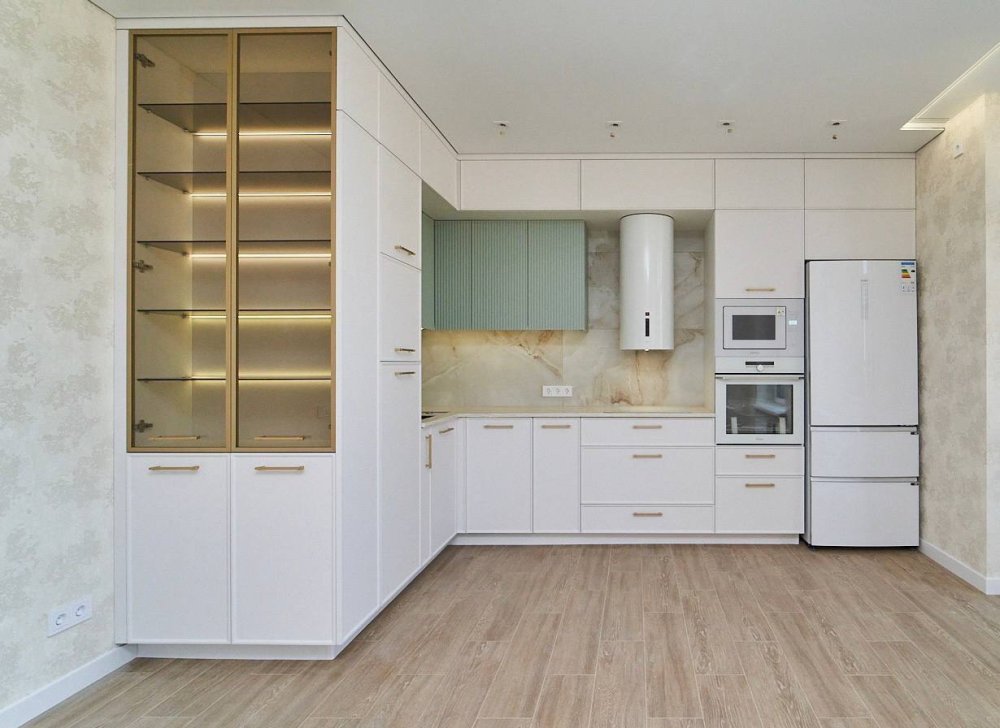 Современный вариант стыковки мебели с потолком: установить кухню с верхней планкой, а после уже натягивается потолок от этой планки. Неоспоримый плюс этой конструкции в том, что можно запускать кухню в производство без потолков, ваша мебель точно встанет без зазоров.