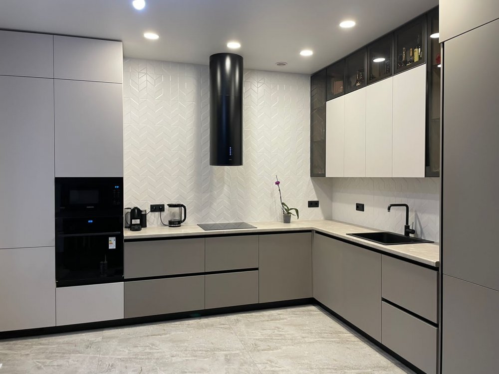 | Дополнительная информация | Друзья, оцените нашу новую работу, получилось очень симпатично: сделали комбинацию из двух цветов и добавили стеклянные фасады в алюминиевой рамке. - фасад Мдф+пленка - размер 3850 мм х 3070 мм - высота 2800 мм - петли и направляющие блюд - толкатели, сушка Италия В левом пенале находится котел. Плитка выкладывалась после установки кухни, поэтому верхний ярус короче на толщину плитки, чтобы ее можно было завести. |